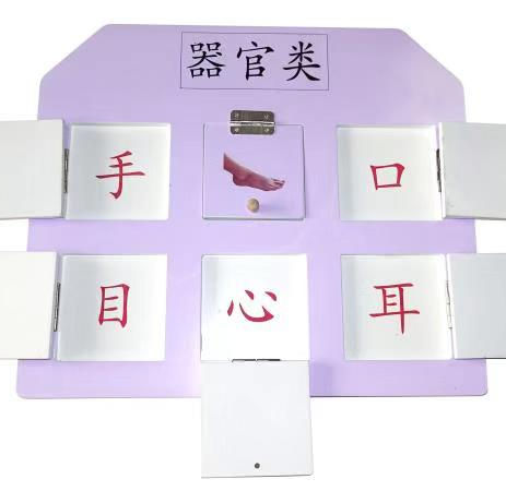 把实物图归类印在各小木门面,孩子打开印有实物图的独立小木门后,便能以图对应部首字,而得以认知。门内的字是以红色砂纸字印上,孩子可用手指触感,产生肌肉记忆,认识字形结构。